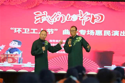 10月26日环卫工人节来临之际,由淮安市文联指导、市曲艺家协会主办、淮阴区城管局承办的“我们的节日”曲艺专场惠民演出在淮阴区城管局温情上演,数百名环卫工人代表齐聚一堂,共度属于他们的节日。 街头巷尾,那一抹橙黄迎风冒雪;车流人海中,扫帚声划破黎明。环卫工人作为“城市美容师”,他们的辛勤付出让城市更加整洁美丽。此次演出旨在致敬一线环卫工人,让他们的奉献被看见、被珍惜和被尊重。淮阴区城管局党组成员、副局长侯帅,淮安市曲艺家协会主席陈常亮,副主席单超、颜卫东、刘俊伟、林霖,秘书长杜飞强,以及淮安市老来依养老产业总经理杨国伟等领导和嘉宾出席本次活动。 演出在女声独唱《美丽的中国梦》中拉开帷幕,歌手刘亚芯嘹亮甜美的歌声,唱出了对美好生活的向往,也唱进了环卫工人的心坎里。随后,阿杜与颜卫东的对口相声《传统与现代》《欢声笑语》妙趣横生,引得满堂欢笑;相敏龙、林霖和袁小海的群口相声《训徒》,三位艺术家说学逗唱,展现了传统曲艺的魅力;双簧《最佳拍档》更是精彩纷呈,现场掌声此起彼伏。 值得一提的是,本场演出不仅有名家献艺,环卫工人和城管队员也主动登台展示风采。环卫工人徐芹、朱洪莲分别演唱了《说句心里话》和《我只在乎你》,质朴的歌声中饱含着对岗位的热爱。区城管局执法大队的男声小合唱《祖国不会忘记》,整齐有力,抒发了城市管理工作者的赤子情怀,将现场气氛推向高潮。 市曲协副主席刘俊伟表示,一直想近距离为环卫工人演出,他们的奉献精神感染着每一位演职人员,希望通过这样的形式,让艺术真正走进劳动者中间。环卫工人葛梅勤激动地说:“能在自己的节日里欣赏这么高水平的演出,还能看到同事上台表演,心里特别温暖。”。 市曲协主席陈常亮在接受记者采访时指出,此次活动不仅为环卫工人带来了欢乐和祝福,增强了他们的职业归属感和城市认同感,也提升了全市曲艺同仁的才艺水平和文化自信。他进一步强调,全市曲艺家和曲艺爱好者将以党的二十届四中全会精神为指引,在建设文化强国的新征程上,用心用情书写传承中华文脉、坚定文化自信、促进淮安社会和经济高质量发展的辉煌新篇章。(朱玉石 杜飞强) 编辑:王世红