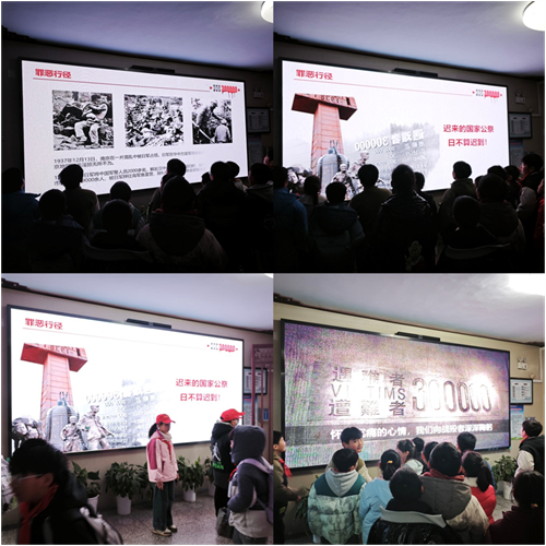 校园大屏同步开启沉浸式宣传,课间与午休时段循环展播南京大屠杀的历史影像。当30万遇难同胞的数字缓缓浮现,师生们神情凝重,不少同学眼眶湿润。短片结尾,幸存者口述与黑白史料交织,真实还原了那段山河破碎的黑暗岁月。同学们不由自主的大声喊出“勿忘国耻,振兴中华”,誓言响彻校园,此时历史的记忆深深镌刻在少年心中。
