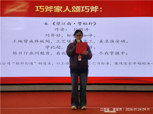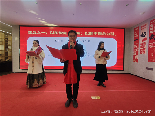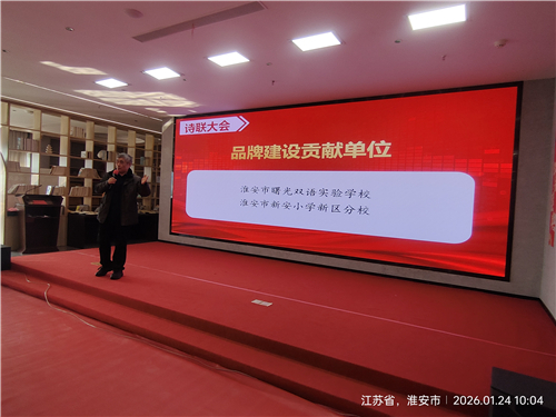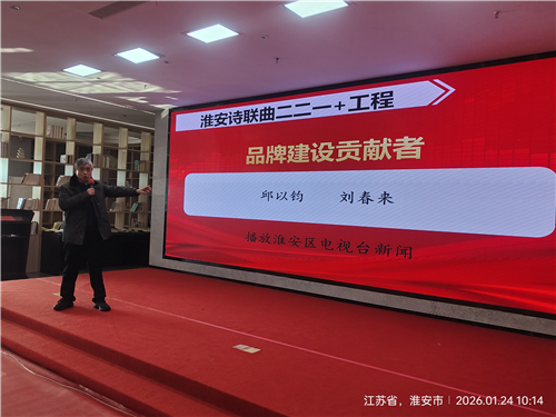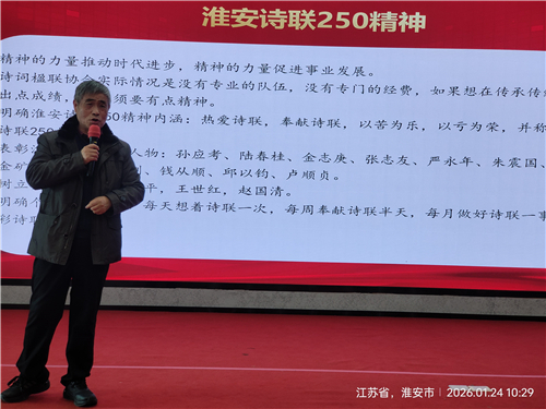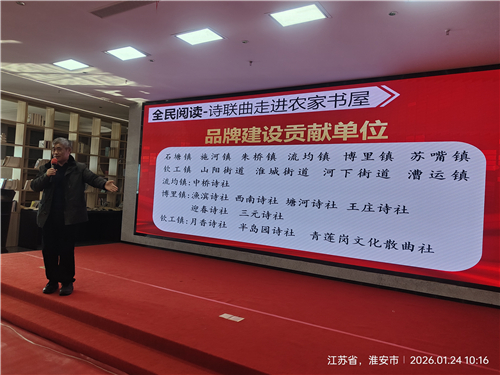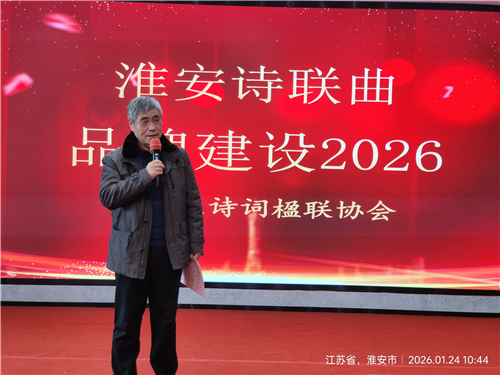 1月24日上午,淮安区诗词楹联协会在巧斧家居一楼大厅隆重举行淮安儒商沙龙2026暨淮安诗联曲品牌建设2025会议。区儒商沙龙组成单位负责人,各镇(街道)诗词楹联协会会长,各村居诗社社长,区诗词楹联协会党支部书记、会长、秘书长、直属诗社曲社社长,13所中小学校分管诗教工作的负责人,近100人参加会议。淮安市委老干局副局长、淮安市诗词协会常务副会长干国宇,涟水县诗词协会会长李亚夫,清江浦区诗词协会副会长、原淮安市诗词协会副秘书长钱万平,洪泽区诗词协会副会长陈幼实、赵绪林等单位领导应邀出席会议。会议由区诗词楹联协会会长周学俊主持。 会议分淮安儒商沙龙2026(首场活动)与淮安诗联曲品牌建设2025两个阶段进行。 第一阶段,淮安儒商沙龙2026,共巧斧家人颂巧斧、诗人联家颂巧斧、诗联名家颂巧斧、书籍书画赠巧斧四大篇章。巧斧家居30名年轻员工首先登场,他们声情并茂地诵读自创诗词,字里行间饱含着对企业的热爱、对匠心的坚守,赢得全场阵阵掌声。河下古镇传统文化沉浸式体验金牌导师王万军、王玲玲、王露娟三位共同朗诵的区75名诗人联家为巧斧家居15大企业理念精心创作的诗联曲作品,把“家装靠谱,就找巧斧”的企业经营理念演绎得淋漓尽致。淮安诗联250精神形象大使、区诗词楹联协会副会长王世红诵读诗联名家孙群为巧斧家居特别创作的《巧斧家居赋》,道出了巧斧家居总经理吕万红艰辛创业的经历与奋斗奉献后取得的成就,使诗联文化与企业精神催生共鸣。孙群向巧斧家居赠送了自己创作的长篇历史小说《马钧》与新诗集《键盘敲落窗前月》。刘春来与颜廷云分别向巧斧家居赠送了书画作品。参会嘉宾还参观了巧斧家居企业文化建设成果展。 、 第二阶段,淮安诗联曲品牌建设2025。通过主席台大屏将2025年“五大工程”建设的品牌逐一向与会者进行展示。一是淮安区诗联“百千万工程”——播种希望、奋进奇乐娃、诗联大会、系列丛书、华夏少年诵联励志活动、童声诵古韵。二是二二一+工程。三是联赋能中心工程——儒商沙龙、全民阅读、全球征联。四是河下古镇研学游工程。五是淮安诗联曲精品工程。周学俊会长在介绍“五大工程”的同时,对在工程建设中作出较大贡献的单位和个人给予充分肯定。 江苏省诗词协会、江苏省楹联研究会对会议召开,分别发来贺诗、贺联。 会议结束前,清江浦区诗词协会钱会长、涟水县诗协李会长、淮安市诗协干会长分别作了热情洋溢的讲话。 (王世红 陈伯新)