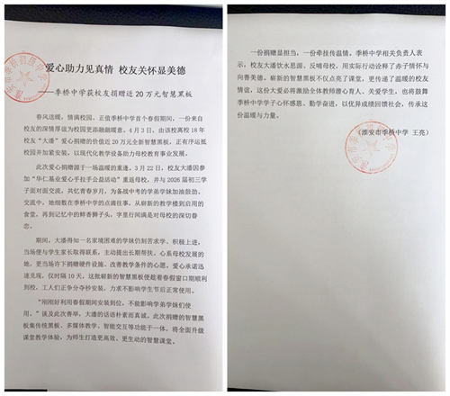 春风送暖,惠泽校园。季桥中学迎来首个春假,融融春意之外,更有校友深情馈赠,为母校送上一份珍贵的春日礼物。4月3日,由校友爱心资助的最新款智慧黑板,正有序进入各个教室完成安装,以现代化教学设备助力学子成长。 3月22日,离校18年的校友大潘因参加“华仁基业爱心手拉手公益活动”重返母校,与2026届初三学生面对面交流,共话求学时光,为备战中考的学弟学妹加油鼓劲。她细数青春记忆:当年刚建成的教学楼、初二才启用的食堂,乃至记忆里鲜香的狮子头,都饱含着对母校的深深眷恋。 交流中,得知一名家境困难的学妹仍坚守学业、刻苦奋进,大潘当场与学生家长取得联系,主动提供帮扶。与此同时,她心系母校发展,当即许下捐赠硬件设施、改善教学条件的心愿。 爱心承诺迅速兑现。仅隔10天,价值近20万元的全新智慧黑板便运抵校园,并趁着春假窗口期加紧安装。谈及此举,她只朴素地说道:刚刚好利用春假期间安装到位,不能影响学弟学妹们使用。 一份捐赠显担当,一份牵挂传温情。校友大潘饮水思源、反哺母校,用实际行动诠释了赤子情怀与向善美德。崭新的智慧黑板将点亮课堂,这份温暖的校友情谊,让老师们更加关爱和鼓励学生,也将激励季桥中学学子心怀感恩、勤学奋进,在成长路上勇毅前行。(李军华) 编辑:王世红